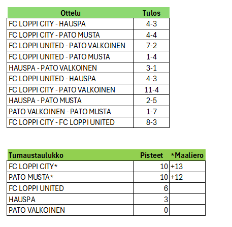 4.10.2025 järjestettiin Launosten tekonurmella syysturnaus poutaisessa, mutta hieman koleassa säässä. Turnauksen aluksi pelattiin harjoitusottelu, jossa kohtasivat FC Loppi punainen ja HYPS:in 2019 syntyneiden joukkue. Kyseinen peli oli uuden FC Loppi punaisen joukkueen ensimmäinen harjoitusottelu. Kentällä nähtiin pientä jännitystä, tiukkoja tilanteita ja iloisia ilmeitä. Tästä on joukkueen hyvä jatkaa eteenpäin. Varsinaisessa turnauksessa oli kolmesta eri seurasta joukkueita. Edustettuina olivat HausPa Hausjärveltä, Pato Tervakoskelta ja järjestävä seura FC Loppi. Joukkueita oli yhteensä viisi. Turnauksessa vallitsi iloinen tunnelma, maaleja ja muita hienoja suorituksia nähtiin paljon. Puffetti piti huolen, jotta katsojille tai pelaajille ei tullut nälkä. Otteluiden tulokset ja turnaustaulukko löytyvät alempaa. Varsinaisen turnauksen jälkeen kentällä pelattiin vielä kahden tyttöjoukkueen kaksi harjoitusottelua. Peleissä kohtasivat FC Loppi pinkit ja Tervakosken Padon T9 joukkue. Näissä kahdessa päivän viimeisessä ottelussa nähtiin myös onnistumisia, iloisia ilmeitä ja jalkapallon iloa.