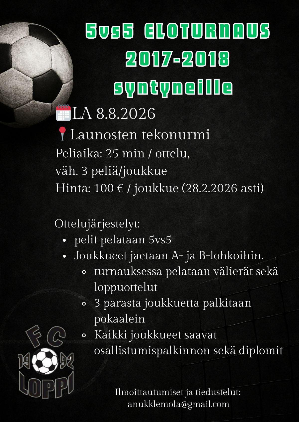 Nyt mukaan kesän futistapahtumaan! Täynnä pelejä, fiilistä ja unohtumattomia hetkiä nuorille pelaajille. Paikat täyttyvät nopeasti - varmista joukkueellesi paikka ja tule mukaan nauttimaan aidosta turnaustunnelmasta!